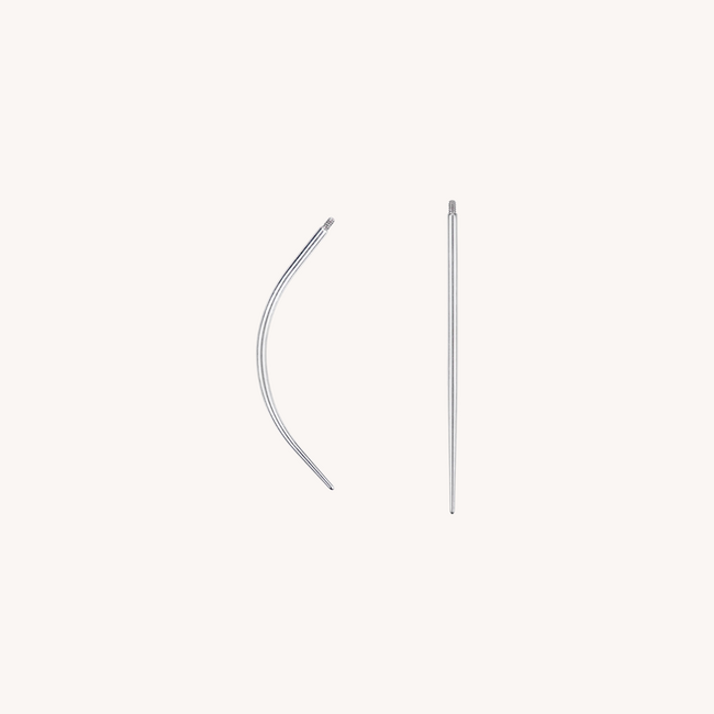 Aantal & Afmetingen Set van 2 steriele piercing tapers — een rechte en een gebogen variant.
